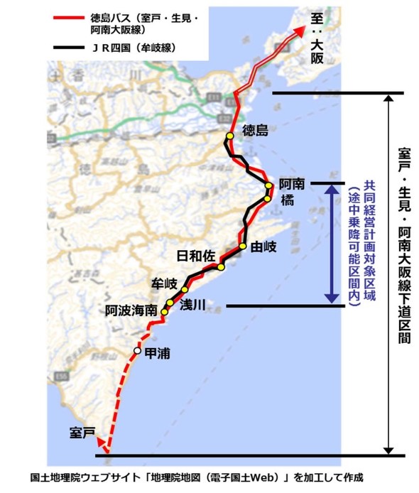 事業者は徳島バスとJR四国。JR牟岐線の阿南駅〜浅川駅間について、JR四国の乗車券(定期券、回数券、フリーきっぷなどを含む)で徳島バスを利用可能とする。なお、阿南駅〜浅川駅間内のみを利用するJR乗車券は徳島バス運賃となる。