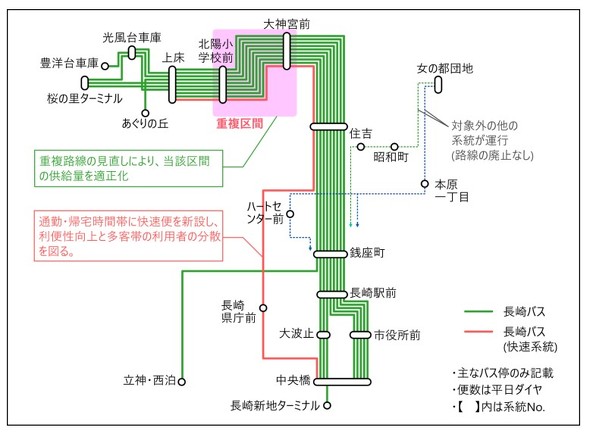 事業者は長崎自動車と長崎県交通局。長崎市内で両社局が重複運行する3地域でバスの運行を最適化し、余剰が発生したバスで運行を維持する路線も共同運営とする。通勤需要の多い時間帯に快速系統のバスを新設して利用者分散と速達性の向上を図る。