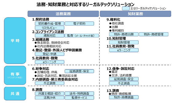 サーバーやパソコンなどのデジタル記録媒体の中に残された証拠を、保全・収集や調査・解析するデジタルフォレンジックを提供する企業は相次いでサービスを開始しており、法務部門・知財部門における主なソリューションは業務全体を網羅するレベルに拡大しています(図参照)。