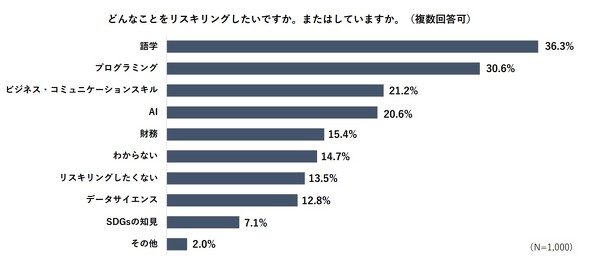 「どんなことをリスキリングしたいか。またはしているか」と尋ねた。すると、「語学」(36.3%)が最も多く、「プログラミング」(30.6%)、「ビジネス・コミュニケーションスキル」(21.2%)、「AI」(20.6%)、「財務」(15.4%)と続いた。