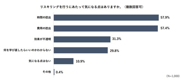 リスキリングにを行うにあたってどういった課題があるか尋ねると、「時間の捻出」(57.9%)と「費用の捻出」(57.4%)が特に多く、「効果が不透明」(31.3%)、「何を学び直したらいいのか分からない」(29.8%)と続いた。