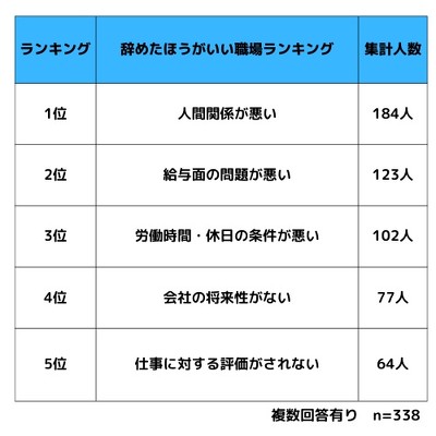 転職サイトメディア「ピコキャリア」を運営するピコラボ(福岡市中央区)は、転職・退職経験のある社会人を対象に「辞めた方がいい職場」に関するアンケート調査を実施した。辞めた方がいい職場を聞き、ランキング化したところ、1位は「人間関係が悪い」(184人)だった。