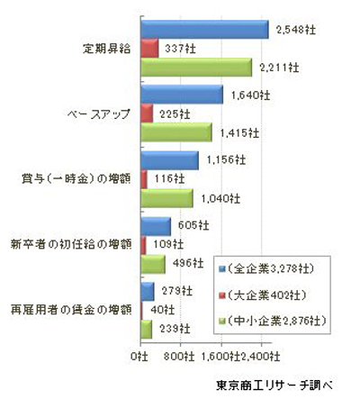 規模別では、「定期昇給」は大企業が83.8%に対し、中小企業は76.8%。「ベースアップ」は大企業が55.9%に対し、中小企業は49.2%で、それぞれ中小企業が7.0ポイント、6.7ポイント下回った。