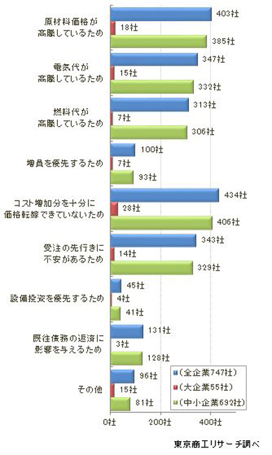 「既往債務の返済に影響を与えるため」は、大企業が5.4%に対し、中小企業は18.4%と約2割に達し、規模による資金繰りの明暗が鮮明だった。「一度上げた賃金を下げることが容易ではない」(ソフトウェア業、資本金1億円未満)など、基本給に係る負担増の理由もあった。