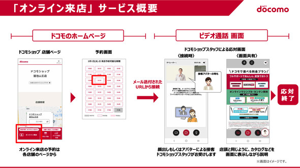 一方、オンライン来店の利用は予約制としている。利用者はドコモのWebサイトにあるドコモショップの店舗ページから希望のショップを選び、オンライン来店の予約を行う。希望時間を選択して予約が完了すると、ビデオ通話用のURLが事前に利用者のもとにメールで届き、予約時間にスマートフォン、タブレット、パソコンからアクセスする、という仕組みだ。