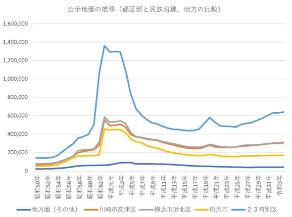 過去を振り返るついでに、こんなデータについても紹介しておきたい。地価の長期時系列推移を示したものだが、ここには日本の富裕層のある側面が見えてくるはずだ。表は、昭和50年(1975年)以降の公示地価の推移から、東京区部、三大都市圏を除いた地方、横浜市港北区(東急東横線沿線)、川崎市高津区(東急田園都市線沿線)、埼玉県所沢市(西武線沿線)のデータを抽出してみた。