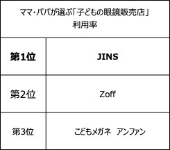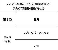 子育て情報誌「あんふぁん」「ぎゅって」を発行するこどもりびんぐ(東京都千代田区)は、子どもの眼鏡購入に関するアンケートを実施した。パパ・ママが選ぶ「子どもの眼鏡販売店」総合満足度1位は「愛眼」、2位は「Zoff」、3位は「JINS」となった。
