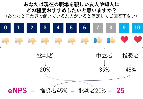 推奨度は0〜10の11段階で尋ね、9〜10点を「推奨者」、7〜8点を「中立者」、0〜6点を「批判者」と分類する。「推奨者」の割合から「批判者」の割合を引いた数値がeNPSとなる。米アップル社などが従業員の愛着度などを測るために導入したことで世界に広がった。