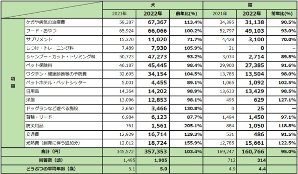 2022年と比較すると、犬の費用は特に防災用品が増え、103.4%と微増傾向。猫は95.0%で微減していた。光熱費については、犬猫ともに増加している。