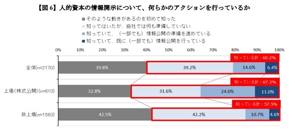 人的資本の情報開示について自身の職場で何らかのアクションを行っているか尋ねたところ、全体では「そのような動きがあるのを初めて知った」(39.8%)が最も多く、「知ってはいたが、自社では何も準備していない」(39.2%)、「知っていて、(一部でも)情報公開の準備を進めている」(14.6%)、「知っていて、すでに(一部でも)情報公開を行っている」(6.4%)と続いた。全体では「知っている」としたのは60.2%だったが、上場企業に限ると67.2%という結果に。