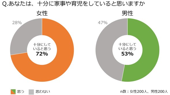 「あなたは十分に家事や育児をしていると思いますか」と尋ねたところ、「十分に行っている」と回答した男性は53%、女性は72%という結果になった。