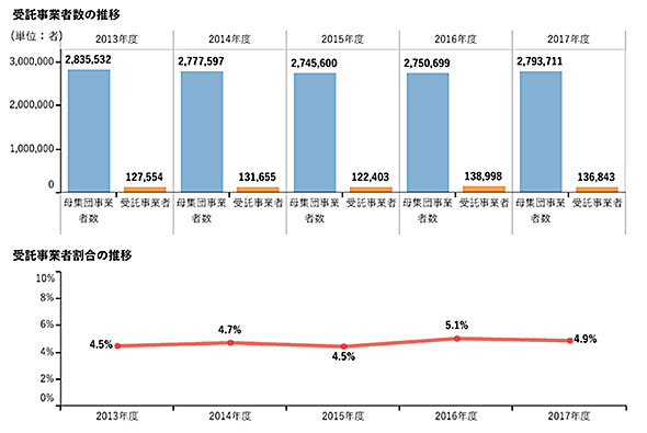 しかも、『「中小企業は大企業に搾取されている」という説は、本当か』の中でも詳しく解説したが、中小企業全体で「大企業の下請け」はわずか5%程度に過ぎない。「大企業が札束で頬を叩いて、町工場の優れた技術を盗む」という定番ストーリーでお馴染みの「製造業」で限ってみても17.4%しかない。この程度の搾取構造で、日本全体の賃金が上がらないのなら、この先100年経っても日本の賃金は上がらない。