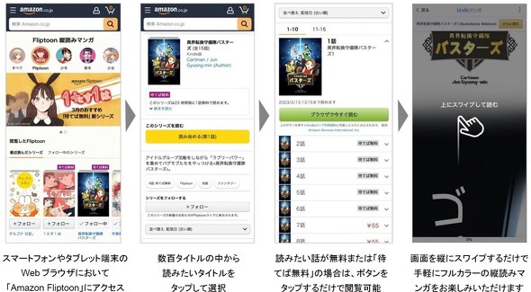 アマゾンジャパンは3月7日、フルカラーの縦読みマンガに特化した新サービス「Amazon Fliptoon (フリップトゥーン)」の提供を開始した。すでに数百タイトル、1万話以上の作品を用意しており、ユーザー獲得を急ぐ。