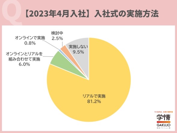 入社式の実施方法については、81.2%の企業が「リアルで実施」と回答した。22年の調査結果(67.2%)から14ポイント増加した。