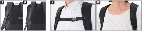 リュック小・中サイズは、太・細2タイプの肩ひもがあり、体型に合わせて選択可能。体の大きな人や中背の人に合わせた「太肩ひも」は、取り外し可能な可動式チェストベルト付き。小柄な人や華奢(きゃしゃ)な人に合わせた「細肩ひも」は、裏側に滑り止めが付いたスッキリとしたデザインにしている。
