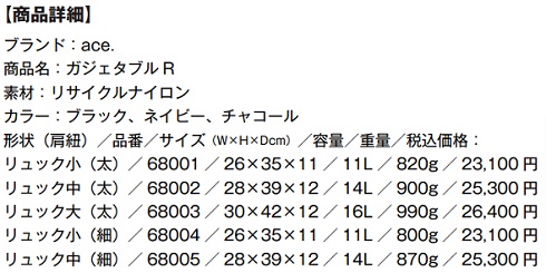 ガジェタブルは混雑した場所でのリュックの持ち方マナーが問題視されたことを受けて、2018年に発売した。「手に持つ」ときはトップハンドル、「棚に上げる」ときはサイドハンドルやベルト簡易収納機能、「前に抱える」ときは縦横どちら向きで抱えても取り出しやすい位置にファスナーやポケットを配置。19年度のグッドデザイン賞も受賞している。