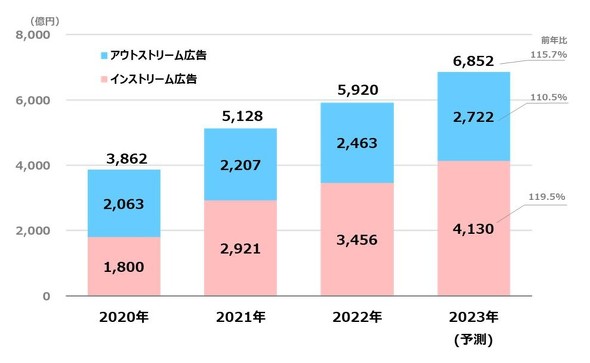 ビデオ(動画)広告市場についても同様の見解を発表。前年比115.7%と引き続き高い成長率を維持し、6852億円まで拡大すると予測している。