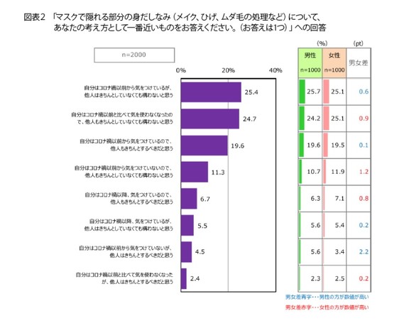メーク、ひげ、ムダ毛といったマスクで隠れる部分の身だしなみについて一番近い考え方を尋ねると、「自分はコロナ禍以前から気をつけているが、他人はきちんとしていなくても構わないと思う」(25.4%)と、「自分はコロナ禍以前と比べて気を使わなくなったので、他人もきちんとしていなくても構わないと思う」(24.7%)がトップ2という結果に。