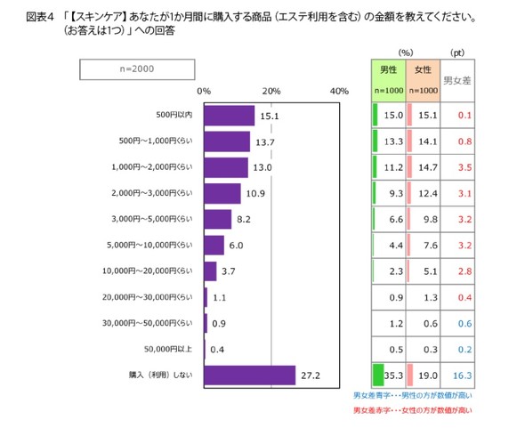 1カ月でスキンケア商品に使う金額については、「500円以内」(15.1%)が最多で、「500〜1000円くらい」(13.7%)、「1000〜2000円くらい」(13.0%)と続いた。購入する金額について男女差はほとんどなかった。