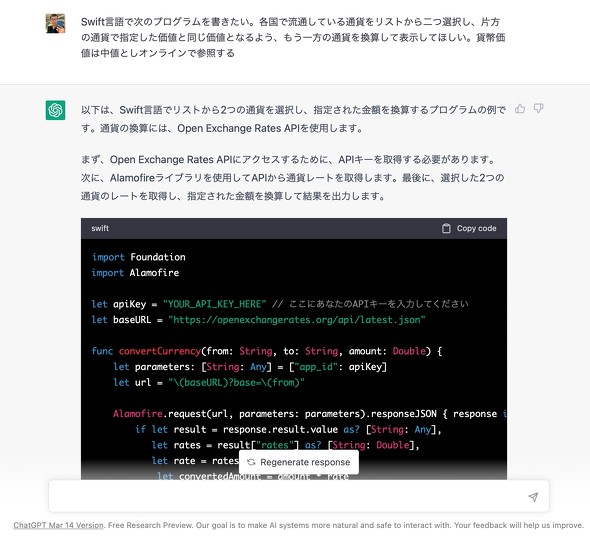 ちなみに先頭で「iOSアプリで次のプログラムをSwift言語を使って書きたい」とすると、先ほどと同じロジックながら、SwiftUIを使用して必要最低限のユーザーインターフェイスをアプリ上に表示して通貨換算するアプリのコードを出してくれた。