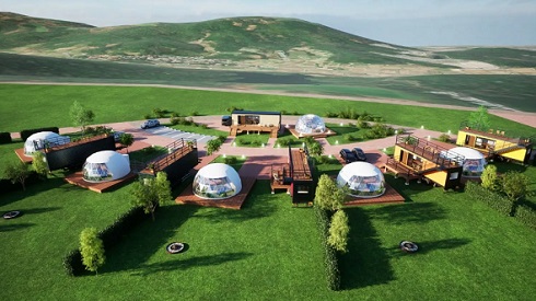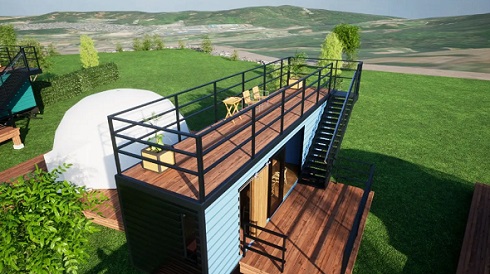 全ての棟にドームテント+トレーラーハウス+250平方メートル以上のプライベートガーデンを備え、食事スペース、個別のたき火台、浴室、トイレを完備した。トレーラーハウスは屋上にあがれるように設計し、大自然の山々を望むだけでなく、夜には星空や、鳥取市街の夜景も満喫できるようにした。