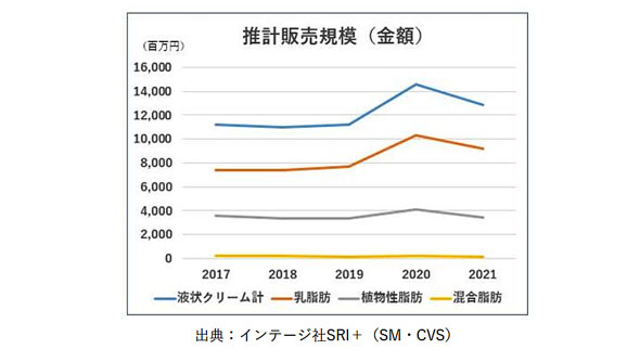 市販の液状クリーム市場(販売金額)をみると、2021年度は17年比114%に拡大。液状クリーム3種(乳脂肪、植物性脂肪、乳脂肪と植物性脂肪を合わせた混合脂肪)の中では、「乳脂肪」クリームの販売規模が70%を占めている(インテージ社調べ)。