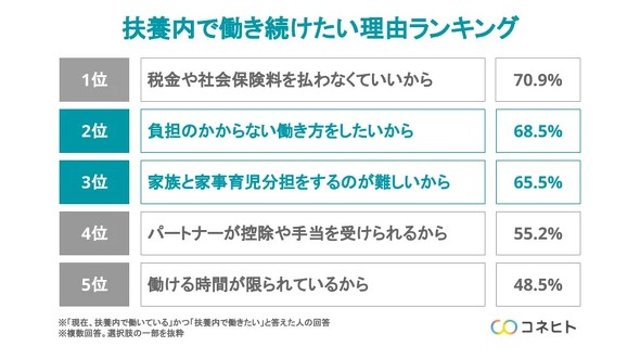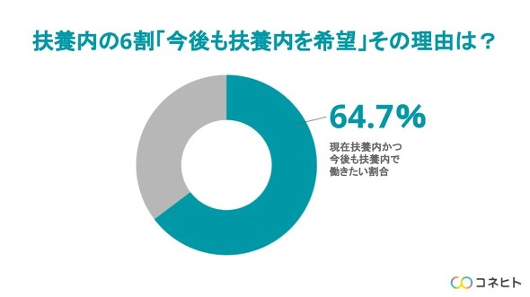 現在扶養内で働いている女性のうち、今後も扶養内で働き続けたい理由として「家事育児の分担の難しさ」が65.5%に上ることが、母親、子育て世帯向けのアプリ開発などを行うコネヒト(東京都港区)の調査によって分かった。