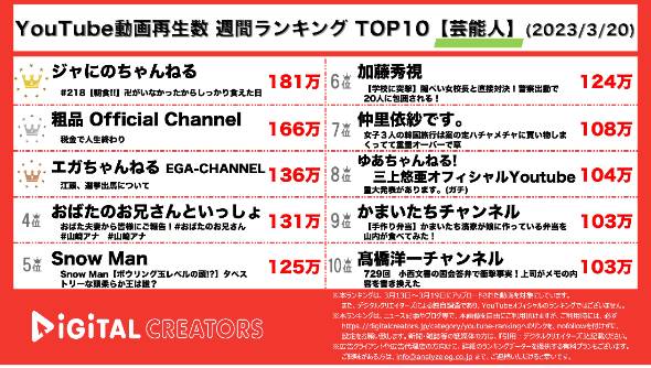 アナライズログ(東京都港区)が運営する「デジタルクリエイターズ」は、3月13〜19日に公開されたYouTubeの週間動画再生数ランキングTOP10を発表した。1位は「ジャにのちゃんねる」で181万再生だった。