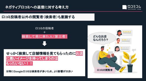 口コミへの返信をする際にまず心得ておくべきことは、返信はネガティブな口コミを投稿した「本人」ではなく、不特定多数の「他の閲覧者(検索者)」の目を意識すべきだという。他の閲覧者にとっては、口コミに書いてあるクレームが本当かどうかは確認しようがないからだ。事業者側が必死に抗弁している姿は、情報収集している多くの閲覧者にとってあまり気持ちの良いものではないだろう。