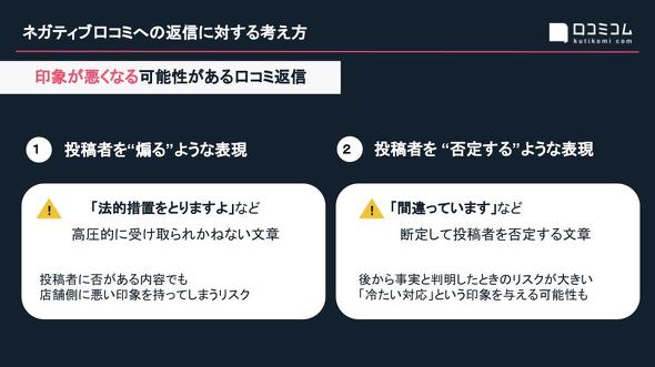 事実でない場合は、放置すると他の閲覧者に悪印象を与える可能性があるため、返信対応でその旨を伝えるべきだ。その際、かえって印象が悪くなってしまう返信が2つある。口コミ投稿者への「高圧的な表現」と、「否定するような表現」だ。