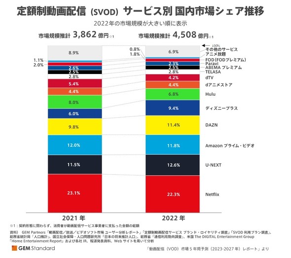 定額制動画配信では熾烈(しれつ)な競争が続く。GEM Partnersの調査によると、2022年の国内シェアは、Netflixが22.3%でトップ。2位にU-NEXT(12.6%)、3位にPrime Video(11.8%)が続く。スポーツジャンルで無料放送とPPVを両立させるABEMAのプレミアムサービスは10位で、2.5%にとどまっている。