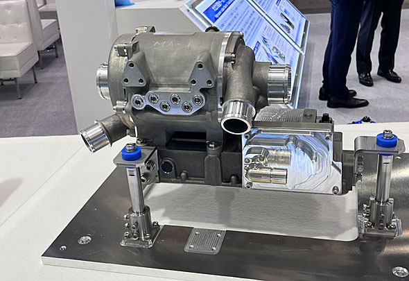 それは中央にモーターを組み込み、両側に遠心式コンプレッサーを備えたもので、これにより2段過給を実現していた。さらに同じ構造ながら燃料電池スタックに圧送した空気が排出された圧力を回収することで、約30%の駆動電力低減を果たすそうだ。