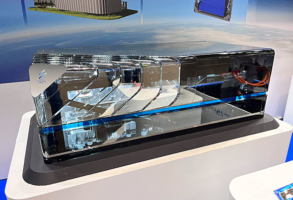 トヨタは水素燃料電池の利用をクルマ以外にも広げるために、モジュールでの提供を始めている。すでにMIRAIで採用されている燃料電池モジュールは燃料電池バス「SORA」で複数搭載されているだけでなく、さまざまな用途で使われ始めている。今回の展示会では、さまざまなサイズの燃料電池モジュールを展示し、水素貯蔵モジュールも披露した。
