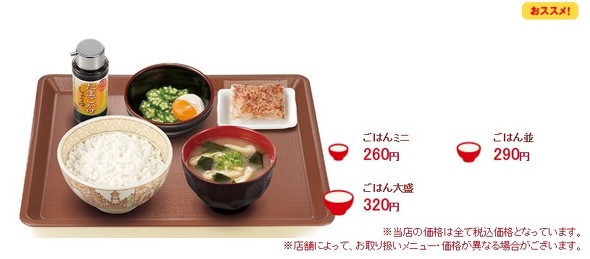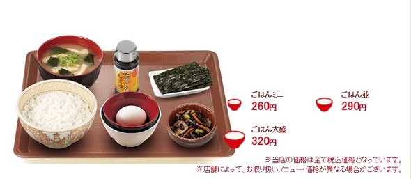 すき家では、ごはん、みそ汁、卵、のり、季節の小鉢で構成される「たまかけ朝食」を290円で提供しています。ごはんを大盛にしても320円です。