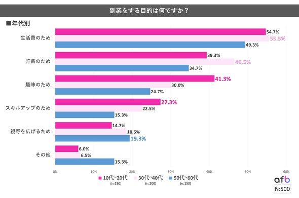 年代別で見ると、どの年代でも上位3項目は「生活費のため」「貯蓄のため」「趣味のため」という結果に。他年代と比較して多かった項目は、10〜20代が「趣味のため」(41.3%)、30〜40代は「貯蓄のため」(46.5%)、50〜60代は「視野を広げるため」(19.3%)だった。同社は「年代によって家族構成が変化し、お金の使い道も変化している」と推察する。