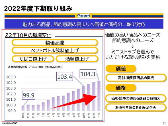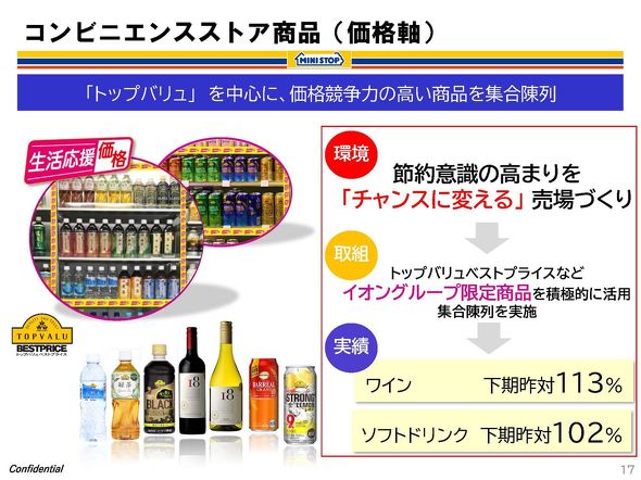 とはいえ、追い風も吹きつつあります。最近では物価高によって消費者の節約志向が高まっています。これをチャンスにして、価格競争力の高いトップバリュ商品を積極的に販売していく狙いを示しています。