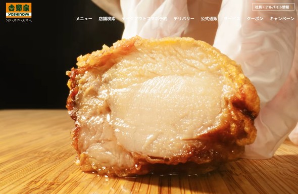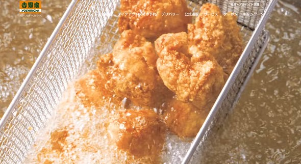 例えば、吉野家の公式Webサイトを開くと、トップページにはから揚げを調理しているシーンが出てくる。一瞬、から揚げ専門チェーンと勘違いしてしまいそうなほどのインパクトがある。