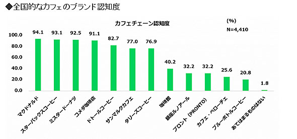 このような動きを見れば、好調をキープする「ロードサイド型喫茶店の覇王」としてもさすがに余裕をかましているわけにはいかない。しかも最近、マックの「脅威」を裏付けるような調査も公表された。総合マーケティングリサーチ事業を展開するRJCリサーチの「カフェのブランド浸透度調査」によれば、マクドナルドは94.1%となんと首位を獲得したのだ。