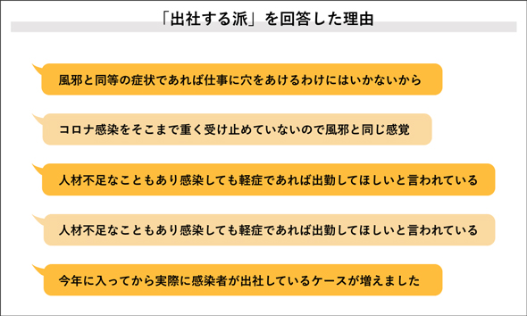 自身がコロナに感染/濃厚接触した際、5日間の自粛推奨期間を前に「出社する」理由を聞くと、全体的にコロナへの警戒意識が下がっていることや、人手不足や業務への責任から休めないこと、中には感染しても出社しているケースは既にあるといった回答もあった。