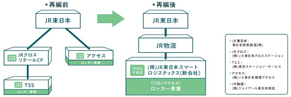 サービスの実現に向け、同社はグループ会社を再編する。東京ステーション・サービスのロッカー事業とJR東日本環境アクセスのロッカー事業を統合し、7月3日に新会社「JR東日本スマートロジスティクス」を設立。ロッカーと物流の連携を推進する。