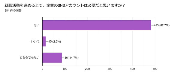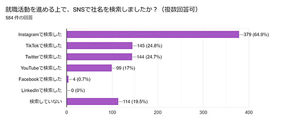 弊社で行った23年卒の大学生への就職活動に関するアンケートでは、就職活動において、64.9%が「Instagram」、24.8%が「TikTok」、24.7%が「Twitter」で企業を検索し情報収集を行っているという結果が出た。さらに、就職活動を進めるにあたり、82.7%が「企業のSNSアカウントが必要だ」と回答している。