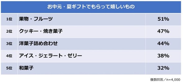 1位の「果物・フルーツ」は、51%が回答した。以下、「クッキー・焼き菓子」(47%)、「洋菓子詰め合わせ」(44%)と続く。