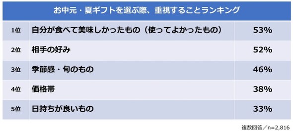 ギフトを選ぶ際に重視するポイントを聞いたところ、1位は「自分が食べておいしかったもの(使ってよかったもの)」で、53%が回答した。2位は「相手の好み」(52%)、3位は「季節感・旬のもの」(46%)だった。