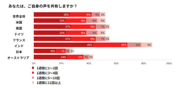 日本については、音声データのオンライン共有は世界7カ国で最も低く、週1回以上の共有が28%、週に5回以上は5%で、世界平均の半分ほどだった。