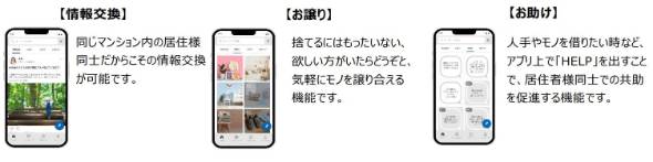 アプリを通じて子育てに関する「情報交換」、使用しなくなった子ども用品の「お譲り」、ちょっとした困りごとに対する「お助け」など、目的に応じてアプリ上で居住者様同士のコミュニケーションを可能とする。また、「屋上テラスで天体観測を体験」「屋上テラスにある屋外菜園で収穫」といったリアルイベントも予定している。