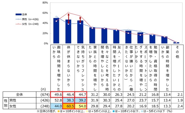 休日が増えてほしいと回答した人に理由を聞くと、「趣味の時間を増やしたいから」が49.6%でトップ。以下、「体が休まらないから」(46.4%)、「気持ちがリフレッシュできないから」(44.7%)が続く。
