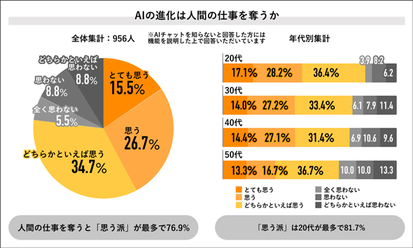 「ChatGPT」をはじめとする対話型AIの登場で、一部では「AIに人間の仕事を奪われるのでは?」との不安の声もあるが、実際はどうなのだろうか。「Job総研」を運営するライボ(東京都渋谷区)が実施したAIチャットボットに関する意識調査では、76.9%が「AIに仕事を奪われると思う」と回答していることが分かった。