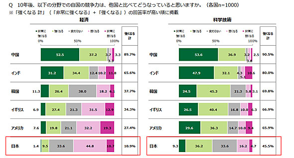 『自分の国の将来について、日本は「良くなる」が13.9%と、他の国に差をつけて6カ国中最下位となった。また、「悪くなる」が35.1%、「どうなるか分からない」が30.7%で、それぞれ6カ国中最も高いスコア。「良くなる」という回答が最も多いのは中国(95.7%)で、次いでインド(83.1%)が多い』(18歳意識調査「第46回-国や社会に対する意識(6カ国調査)-」