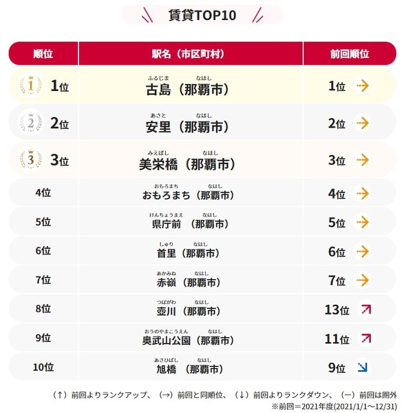 2位は「安里駅」、3位は「美栄橋駅」(いずれも那覇市)となった。4位以下も那覇市内の「おもろまち駅」「県庁前駅」「首里」と、県内唯一の電車であるゆいレールの駅が続いた。