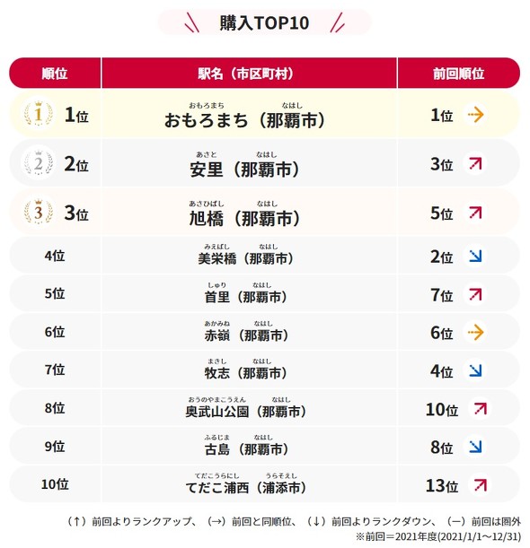 購入物件で最もアクセス数が多かった沖縄の駅は「おもろまち駅」。2位は「安里駅」、3位は「旭橋駅」(いずれも那覇市)となった。